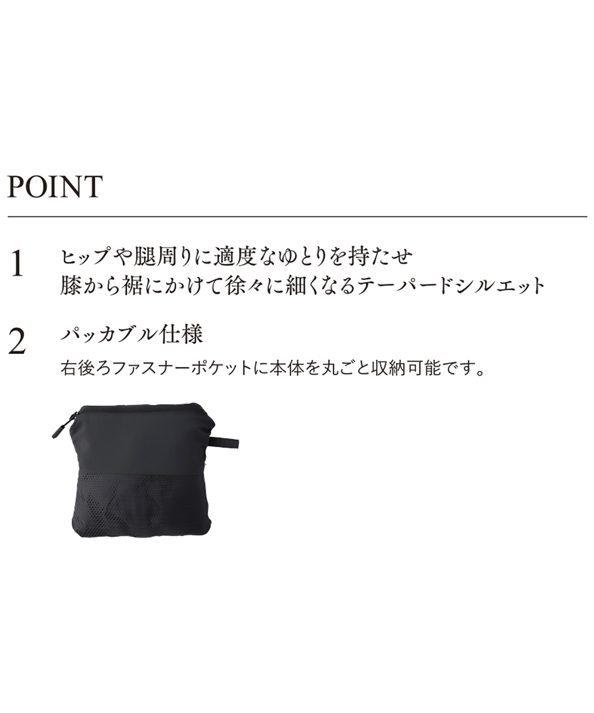 | ヒップや腿周りに適度なゆとりを持たせ膝から裾にかけて徐々に細くなるテーパードシルエット |