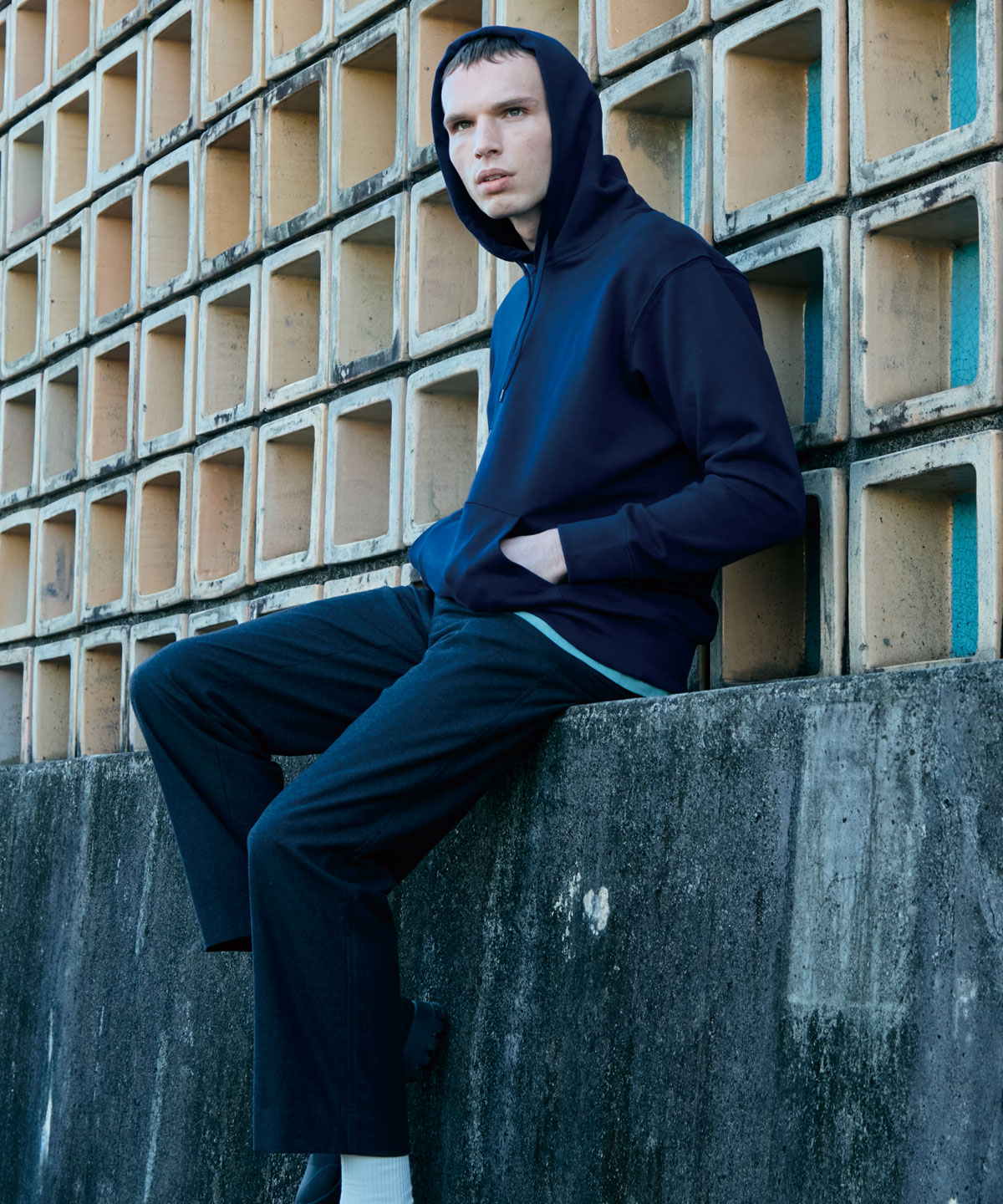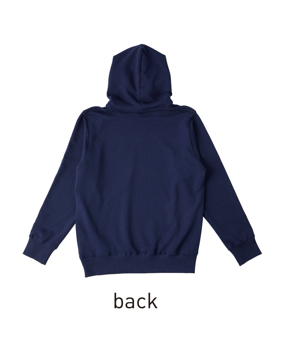 | フード紐口も金具を使用せず、カン止め始末で環境にも配慮した1着。 |