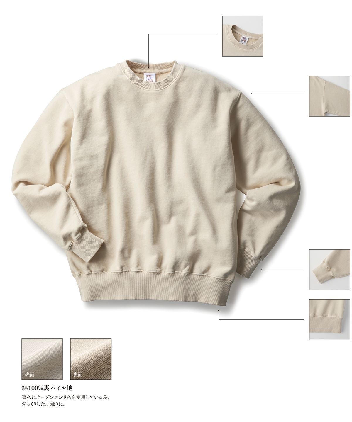 | 綿100%裏パイル地 | 裏糸にオープンエンド糸を使用している為、ざっくりした肌触りに。 |