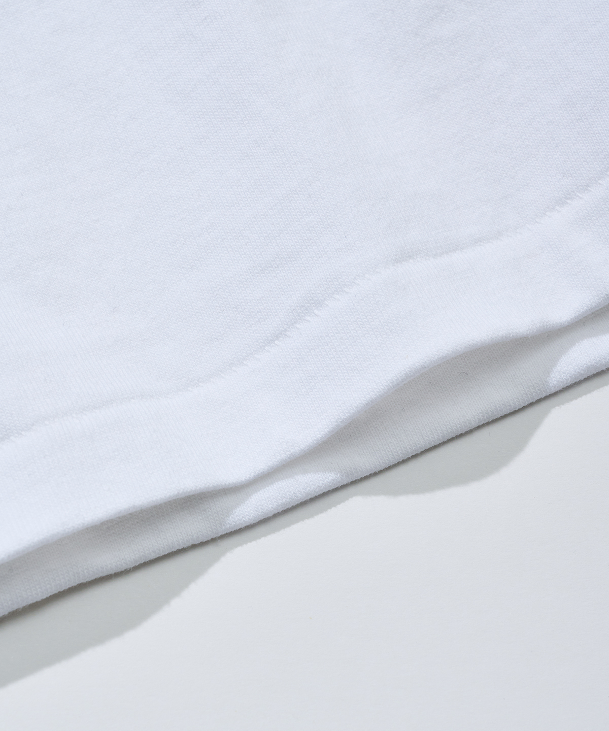 | USAコットン100%使用(オープンエンド糸) | 生地は絶妙なドライタッチを堪能できるUSAコットンを100%使用。 6.6オンスと一般的なTシャツに比べやや厚手の設定です。 厚めでありながらごわつかず、軽い質感の仕上がりは「空紡糸」とも呼ばれるオープンエンド糸のおかげ。 繊維の中に空気を多く含む製造方法で、優れた吸湿性と速乾性が着心地の良さを高めます。 |