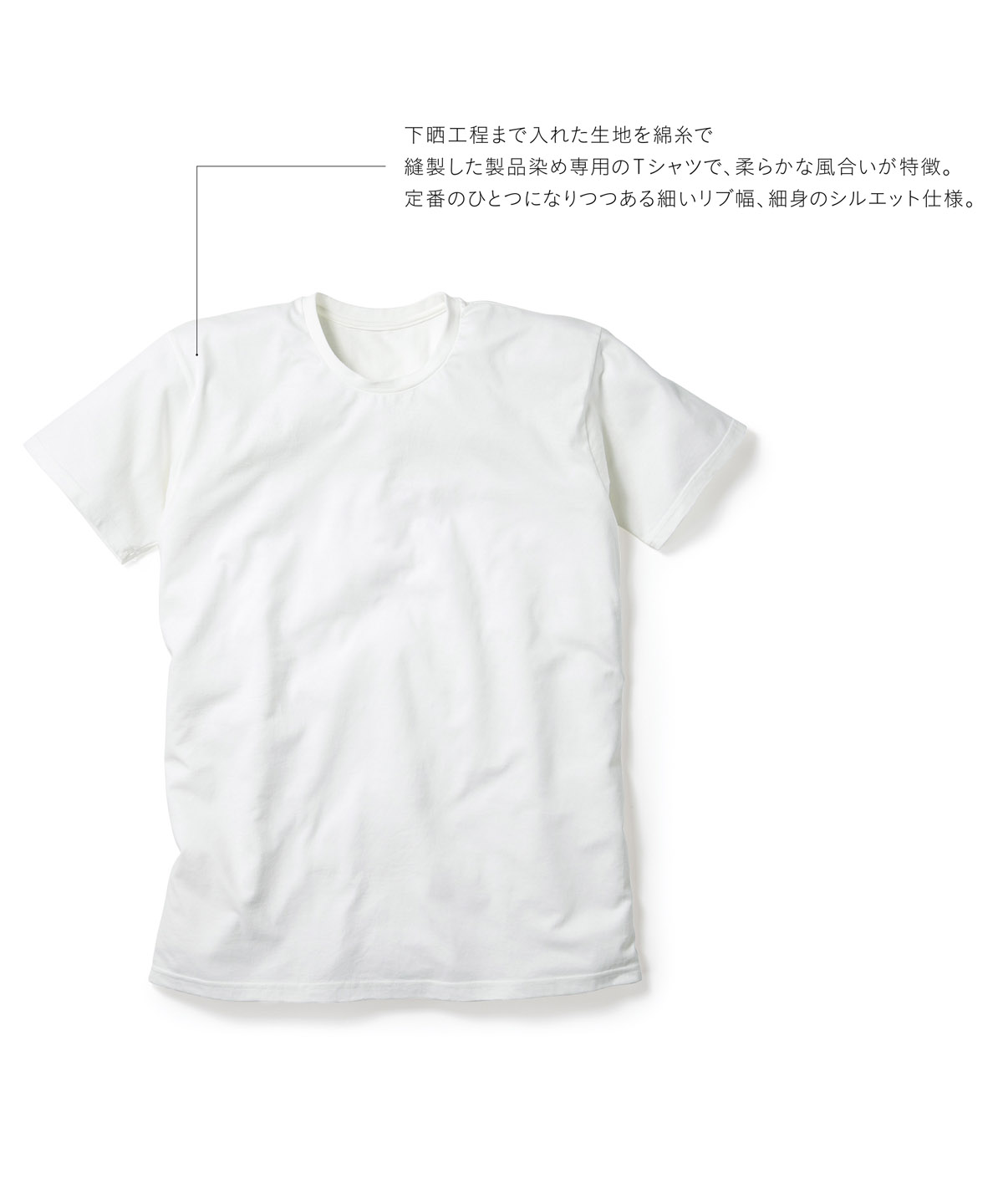 | 下晒工程まで入れた生地を綿糸で縫製した製品染め専用のTシャツで、柔らかな風合いが特徴。 定番のひとつになりつつある細いリブ幅、細身のシルエット仕様。 |