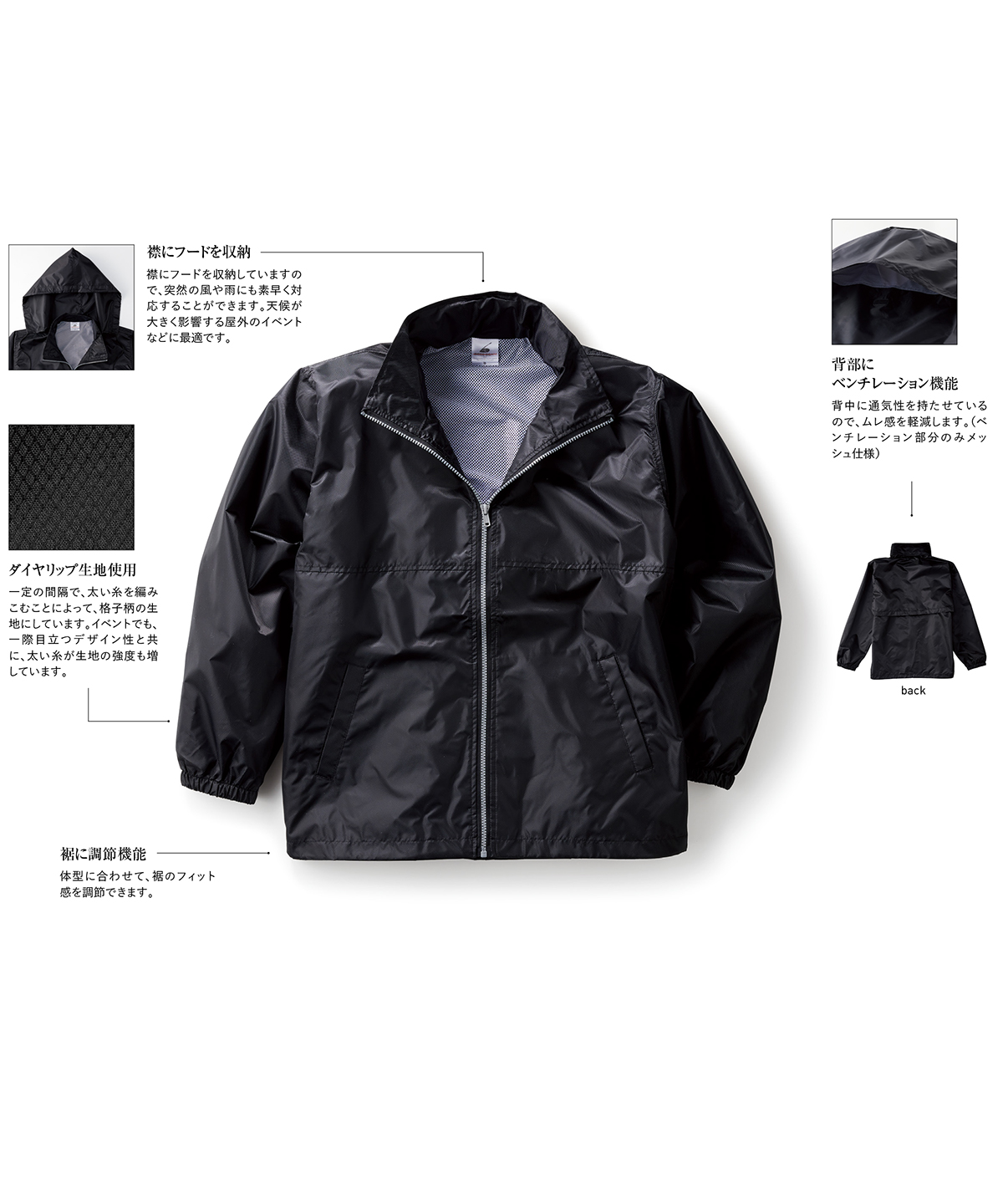 | 襟にフードを収納 | 襟にフードを収納していますので、突然の風や雨にも素早く対応することができます。天候が大きく影響する屋外のイベントなどに最適です。 |