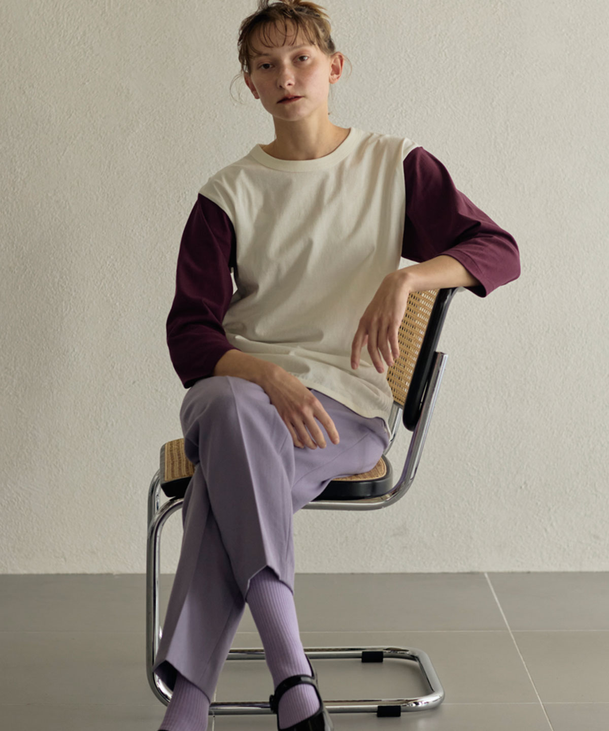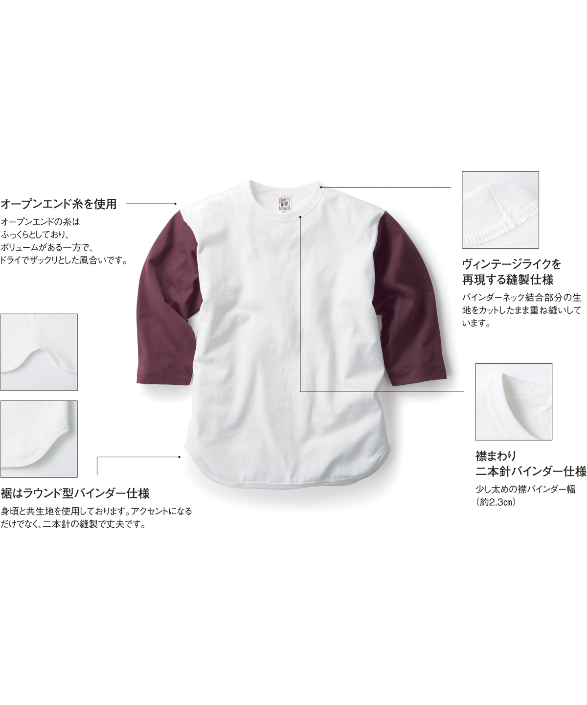 | ヴィンテージライクを再現する縫製仕様 | バインダーネック結合部分の生地をカットしたまま重ね縫いしています。 |