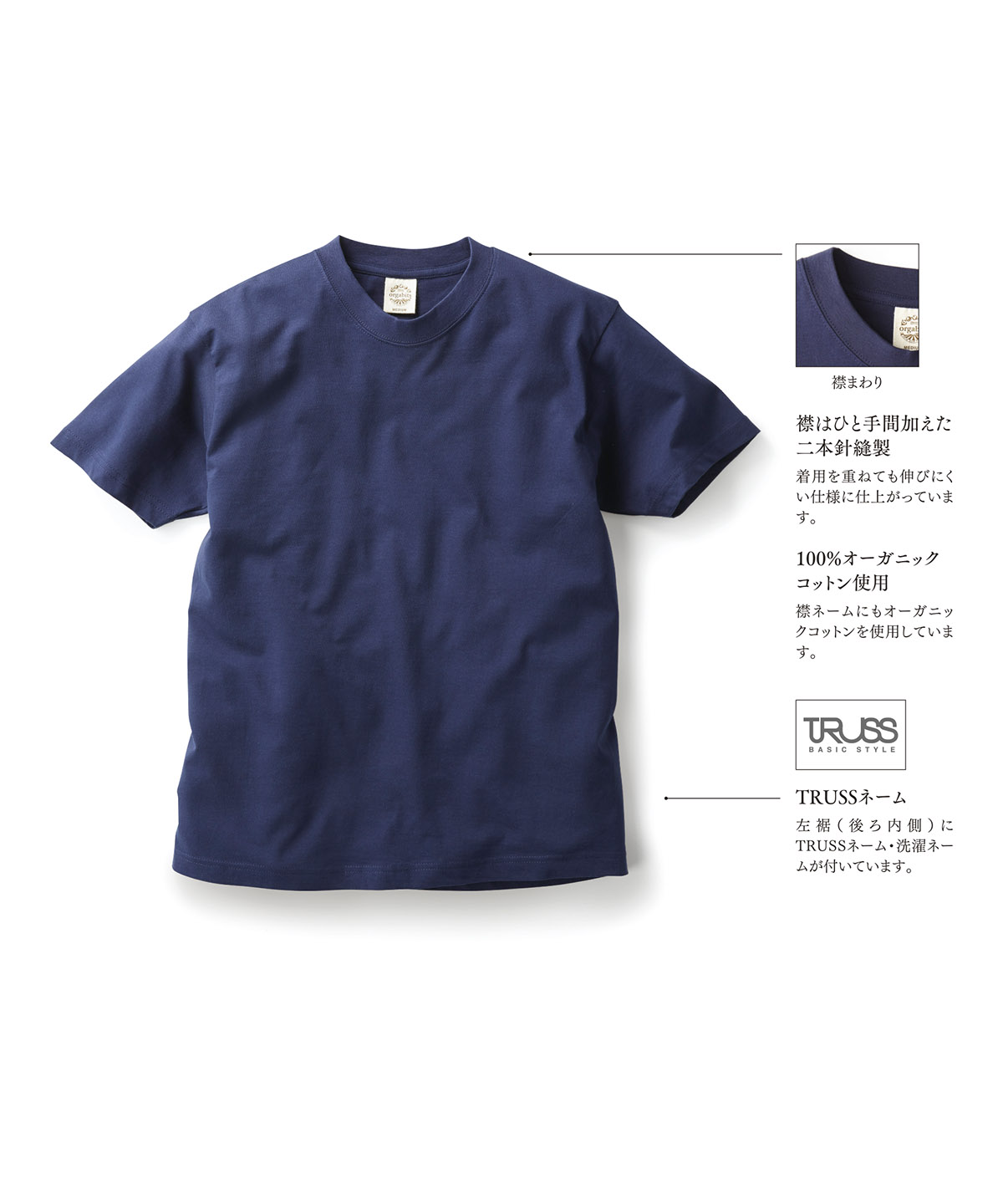 | 100%オーガニックコットン使用 | 襟ネームにもオーガニックコットンを使用しています。 |