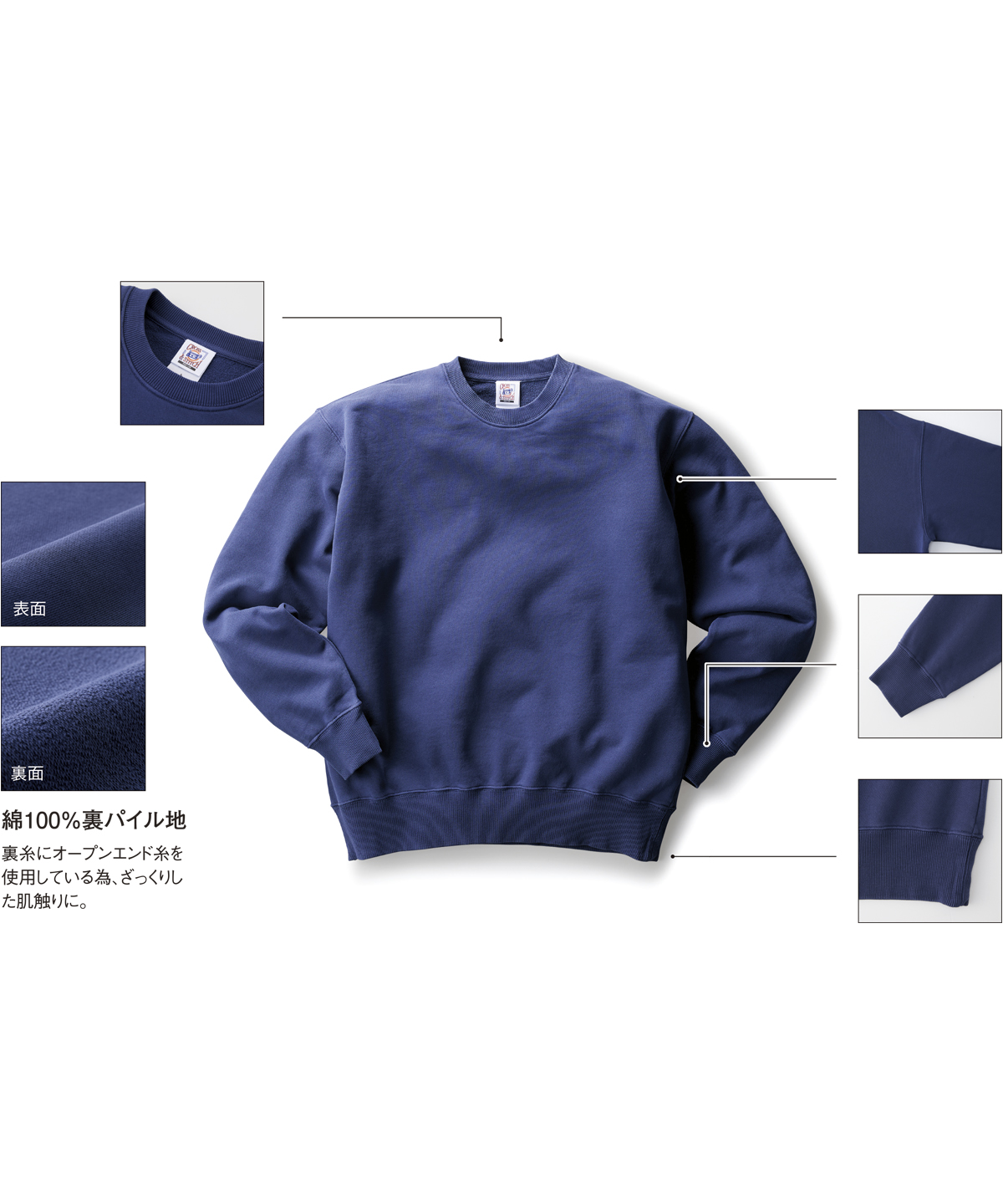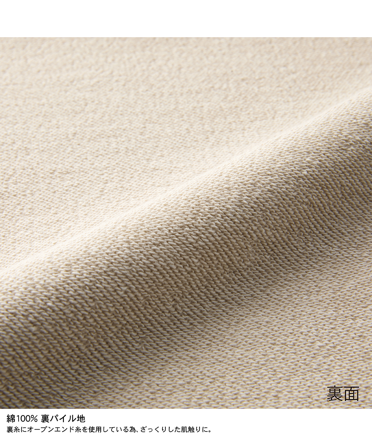 | 綿100%裏パイル地 | 裏糸にオープンエンド糸を使用している為、ざっくりした肌触りに。 |