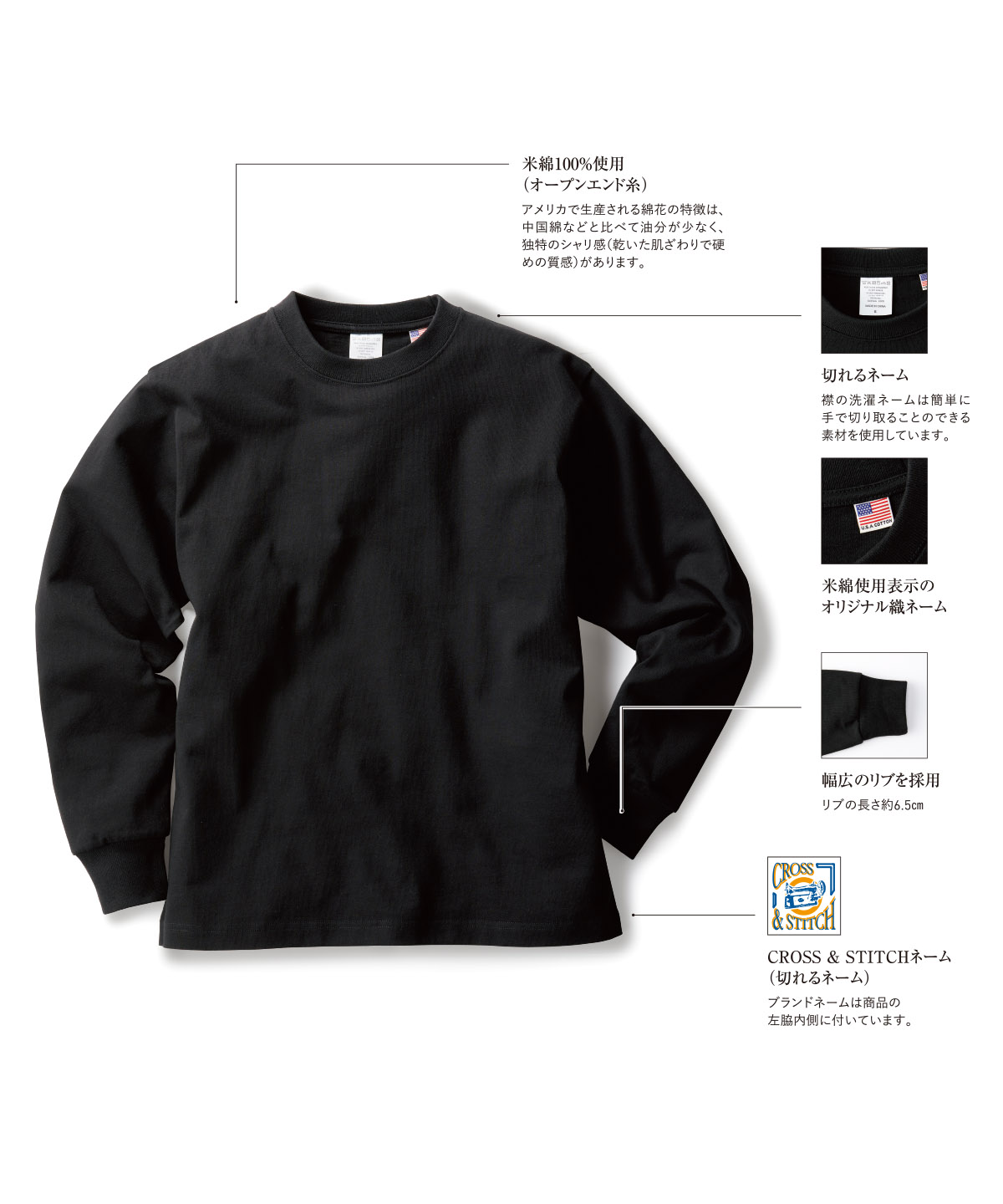 | 米綿100%使用(オープンエンド糸) | アメリカで生産される綿花の特徴は、中国綿などと比べて油分が少なく、独特のシャリ感(乾いた肌ざわりで硬めの質感)があります。 |