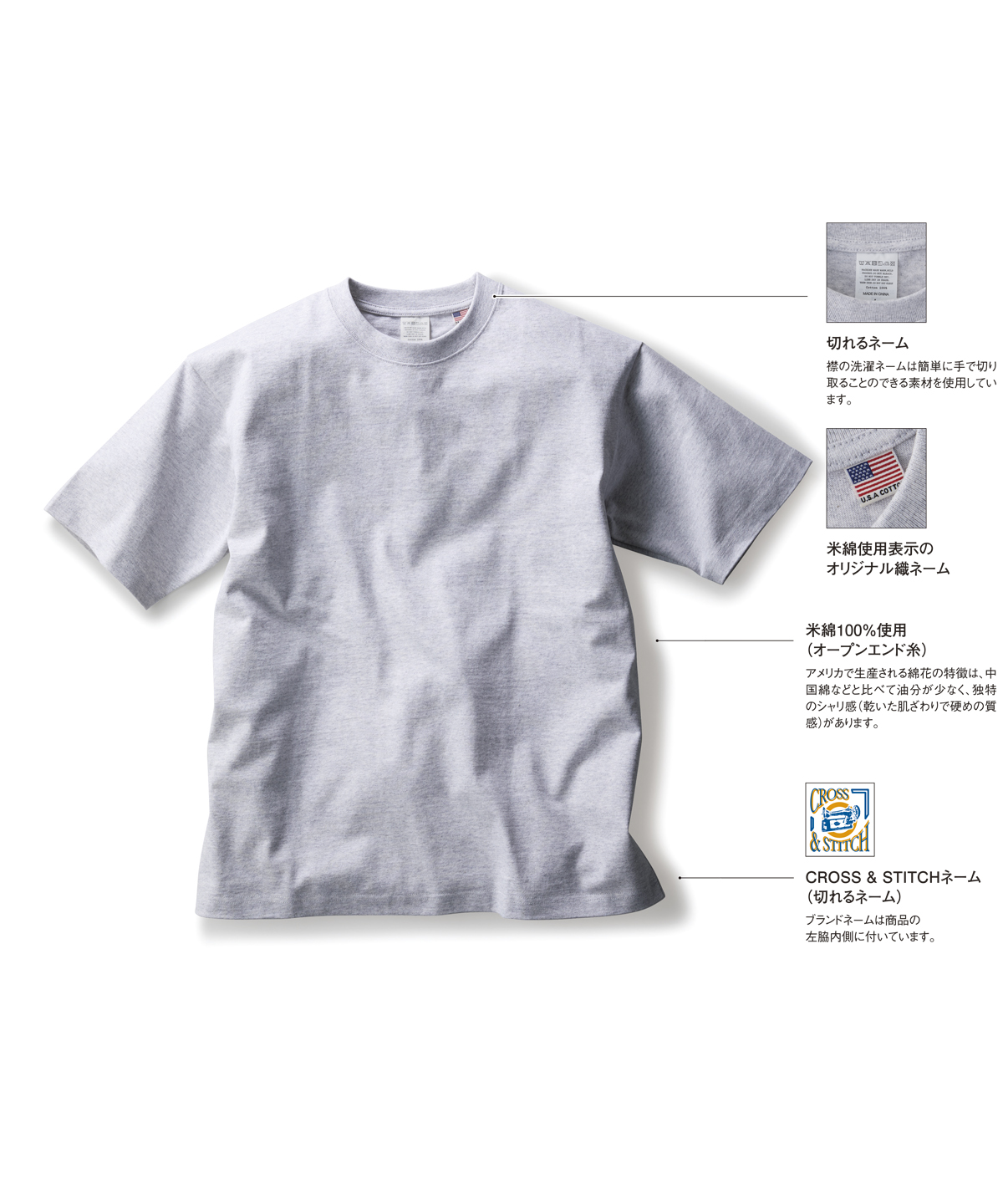 | 米綿100%使用(オープンエンド糸) | アメリカで生産される綿花の特徴は、中国綿などと比べて油分が少なく、独特のシャリ感(乾いた肌ざわりで硬めの質感)があります。 |