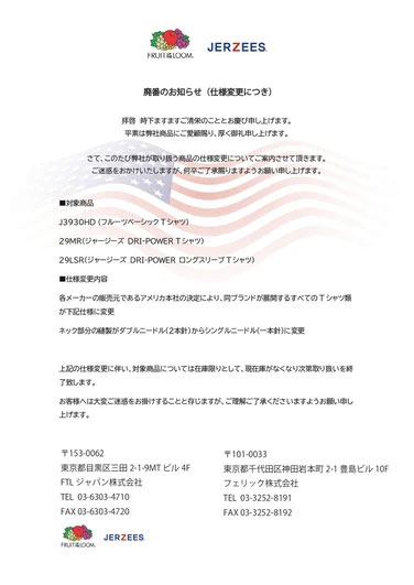 この度、弊社が取り扱うUSAブランド(フルーツオブザルーム・ジャージーズ)のTシャツについて、アメリカ本社の方針により仕様変更が行われることになり、廃番とさせて頂くこととなりました。