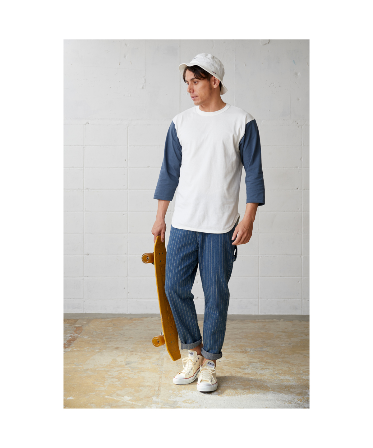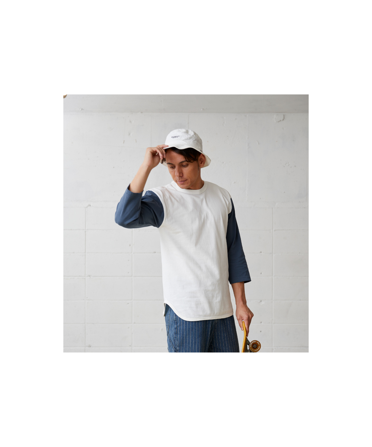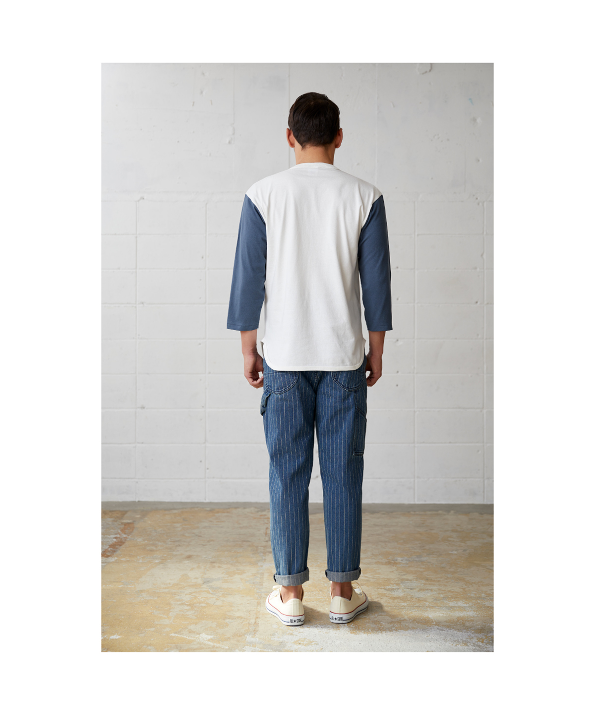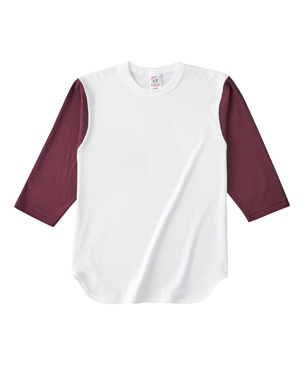 | ヴィンテージライクを再現する縫製仕様 | バインダーネック結合部分の生地をカットしたまま重ね縫いしています。 |