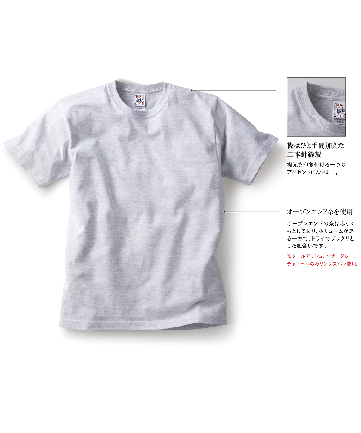 | オープンエンド糸を使用 | オープンエンドの糸はふっくらとしており、ボリュームがある一方で、ドライでザックリとした風合いです。 ※クールアッシュ、ヘザーグレー、チャコールのみリングスパン使用。  |