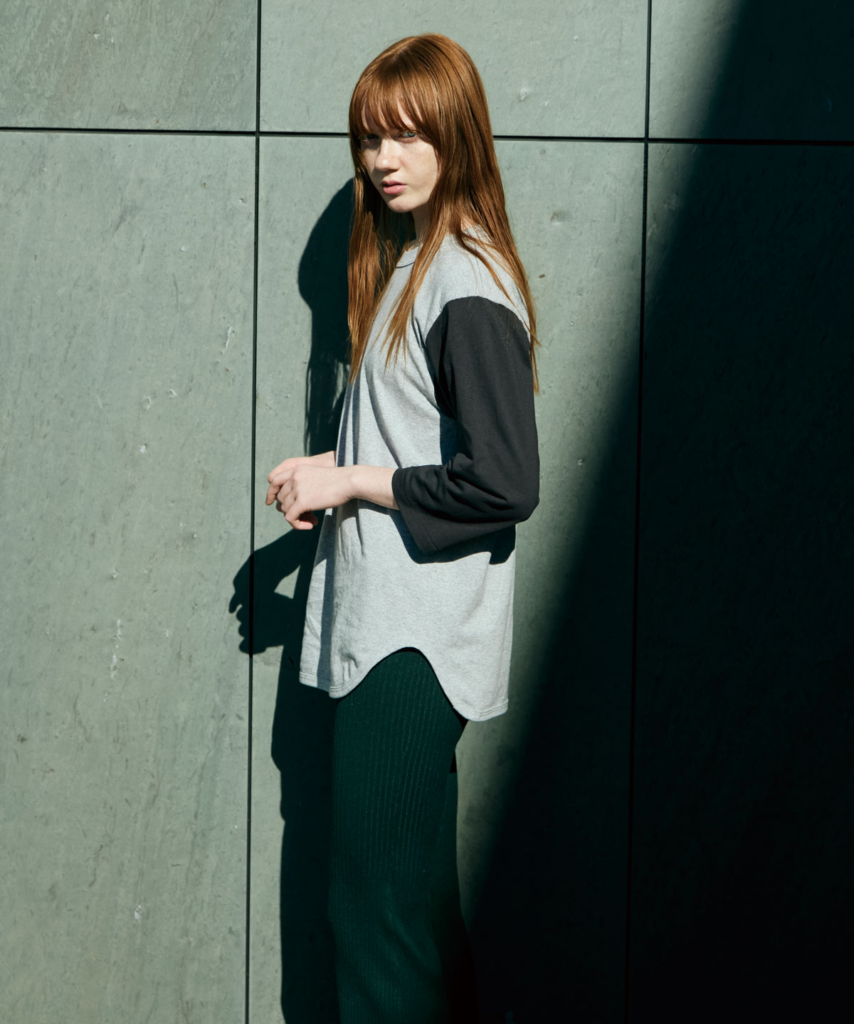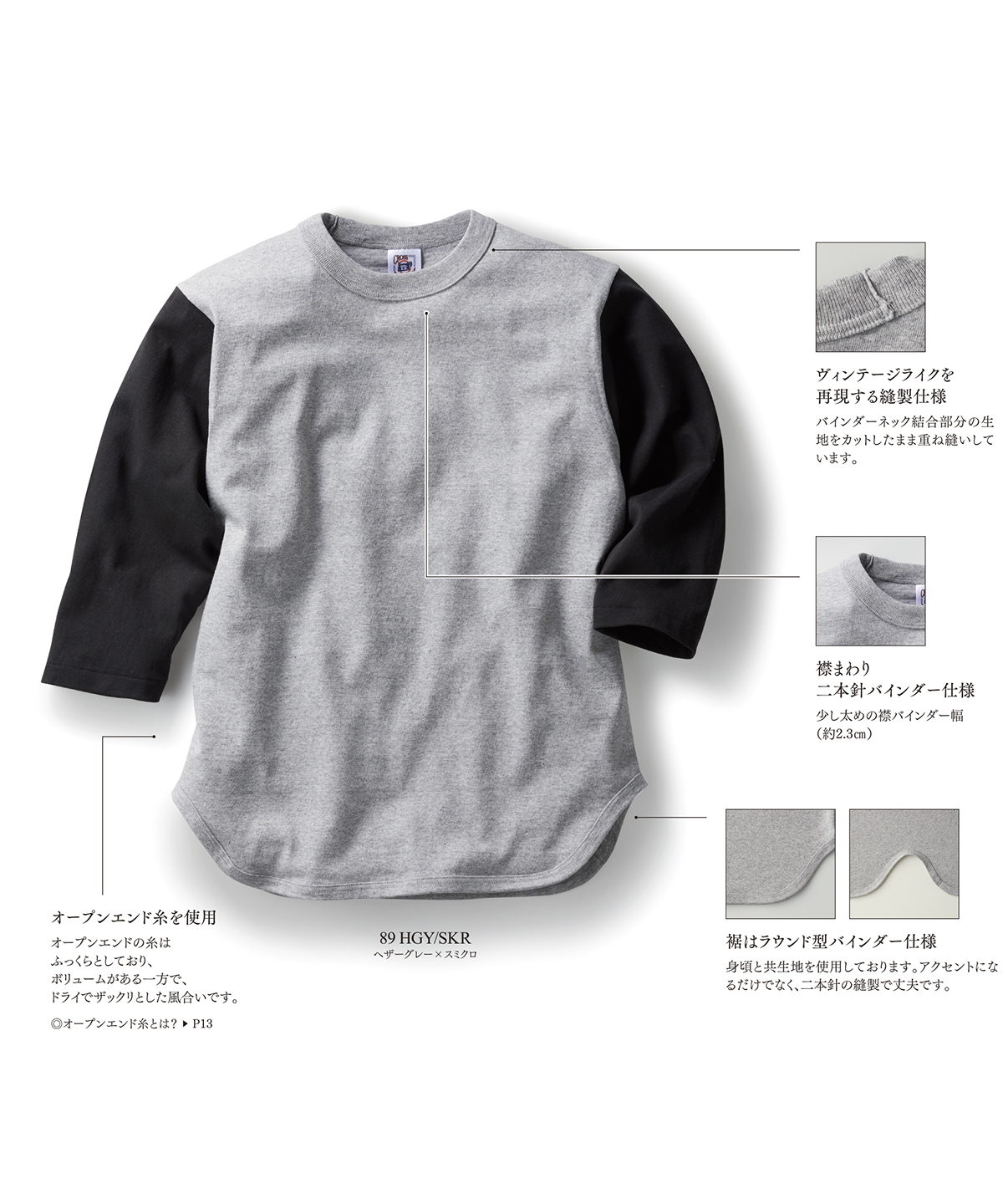 | ヴィンテージライクを再現する縫製仕様 | バインダーネック結合部分の生地をカットしたまま重ね縫いしています。 |