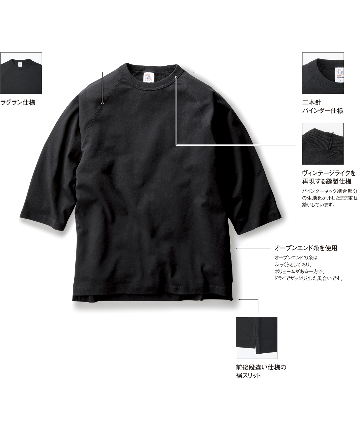 | ヴィンテージライクを再現する縫製仕様 | バインダーネック結合部分の生地をカットしたまま重ね縫いしています。 |