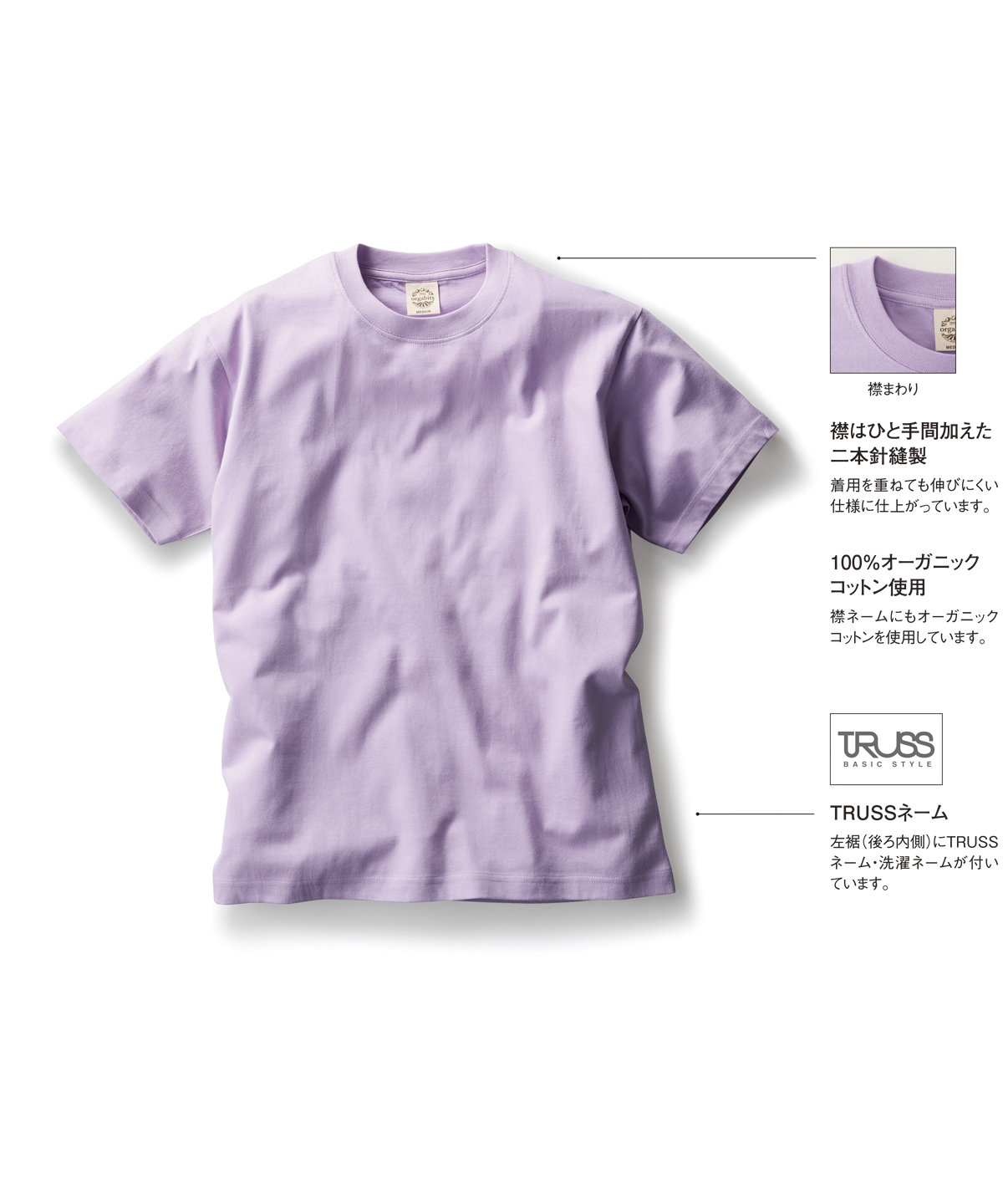 | 100%オーガニックコットン使用 | 襟ネームにもオーガニックコットンを使用しています。 |