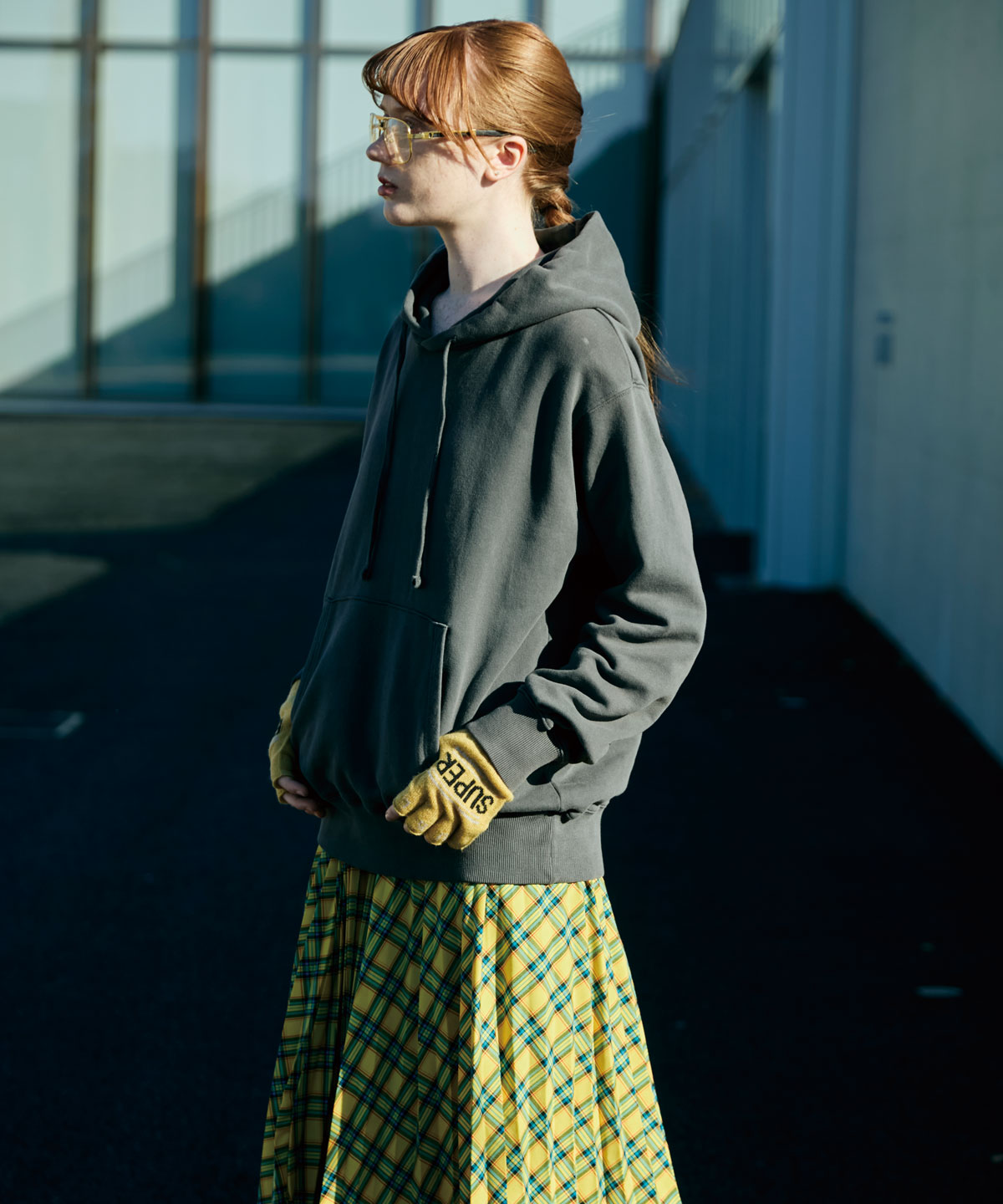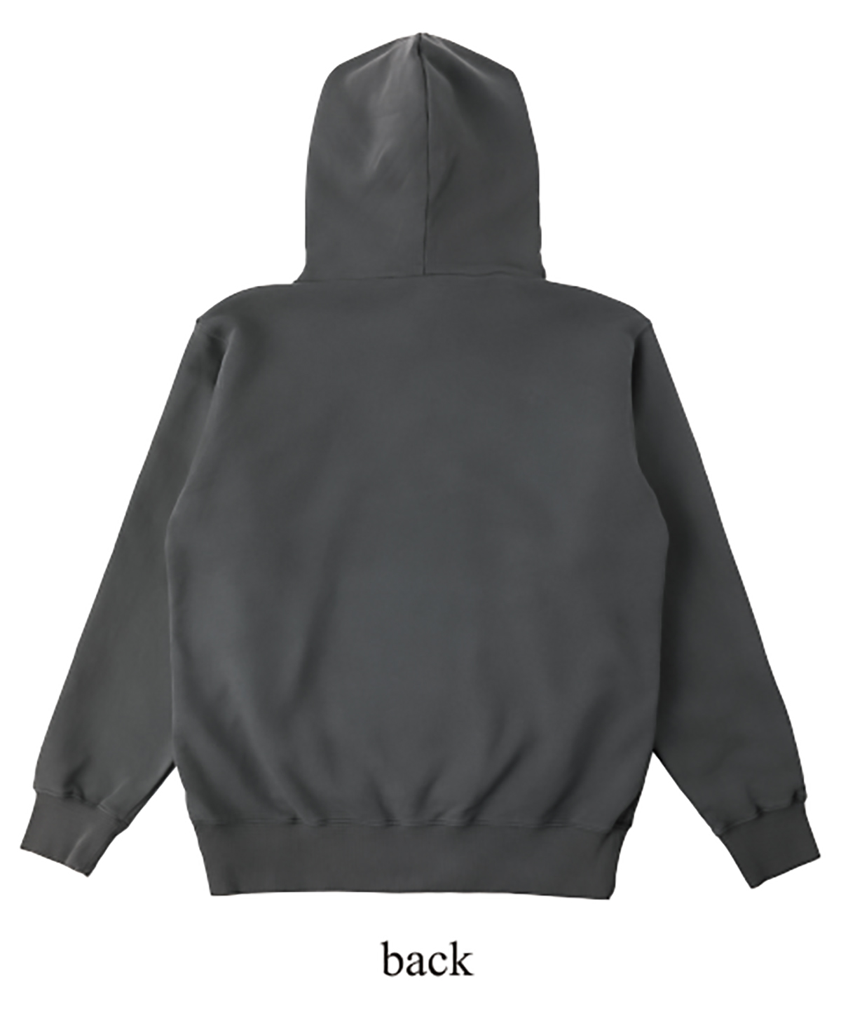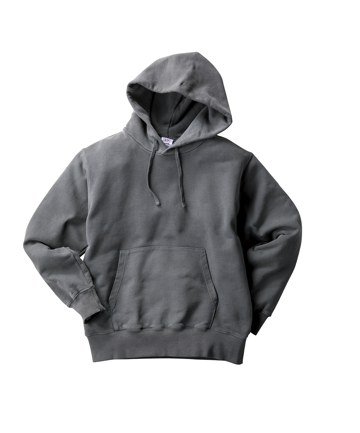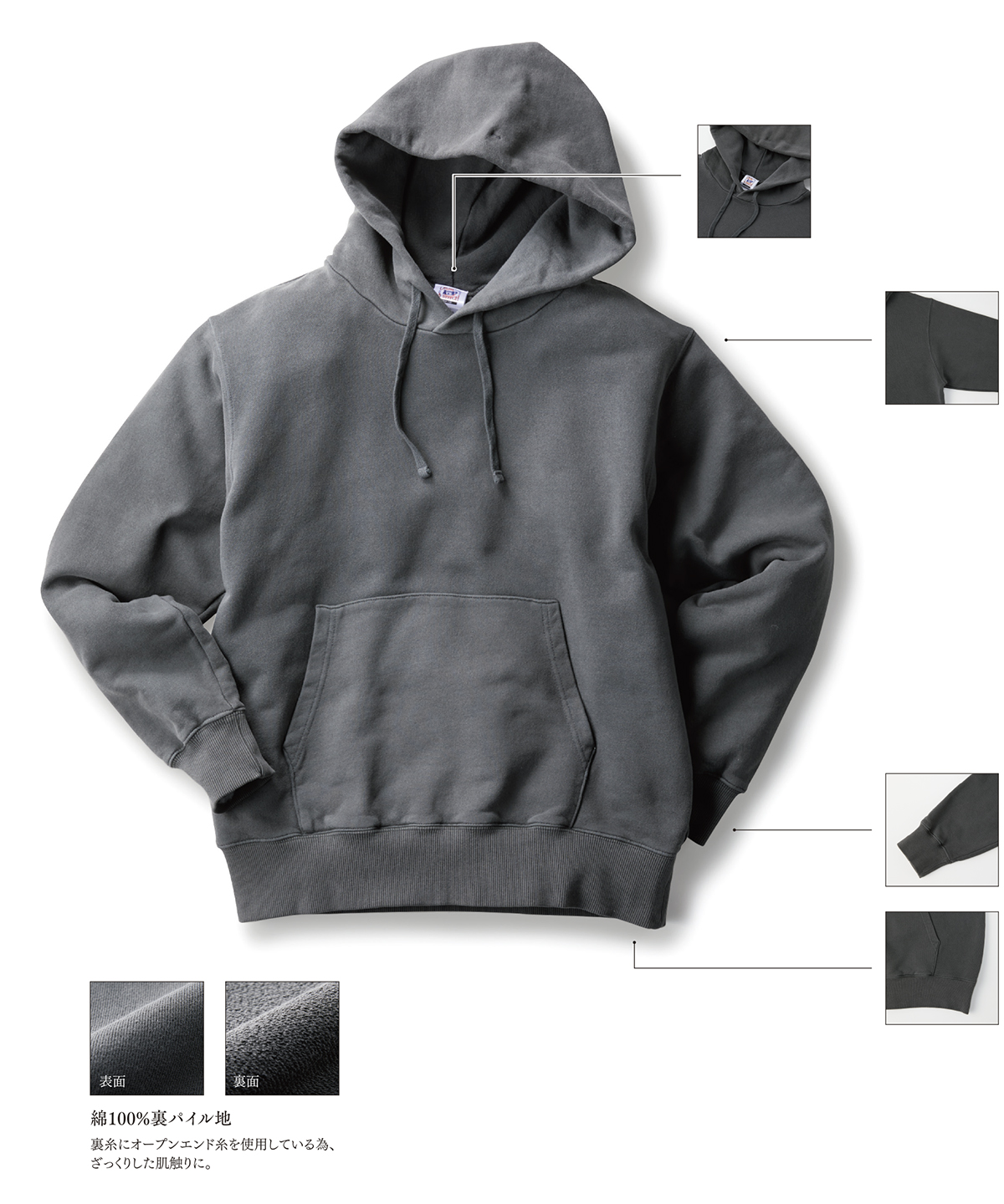 ピグメント(顔料)染めの裏毛パーカ!裏糸をOE(オープンエンド糸)にすることでシャリ感のある肌触りに!