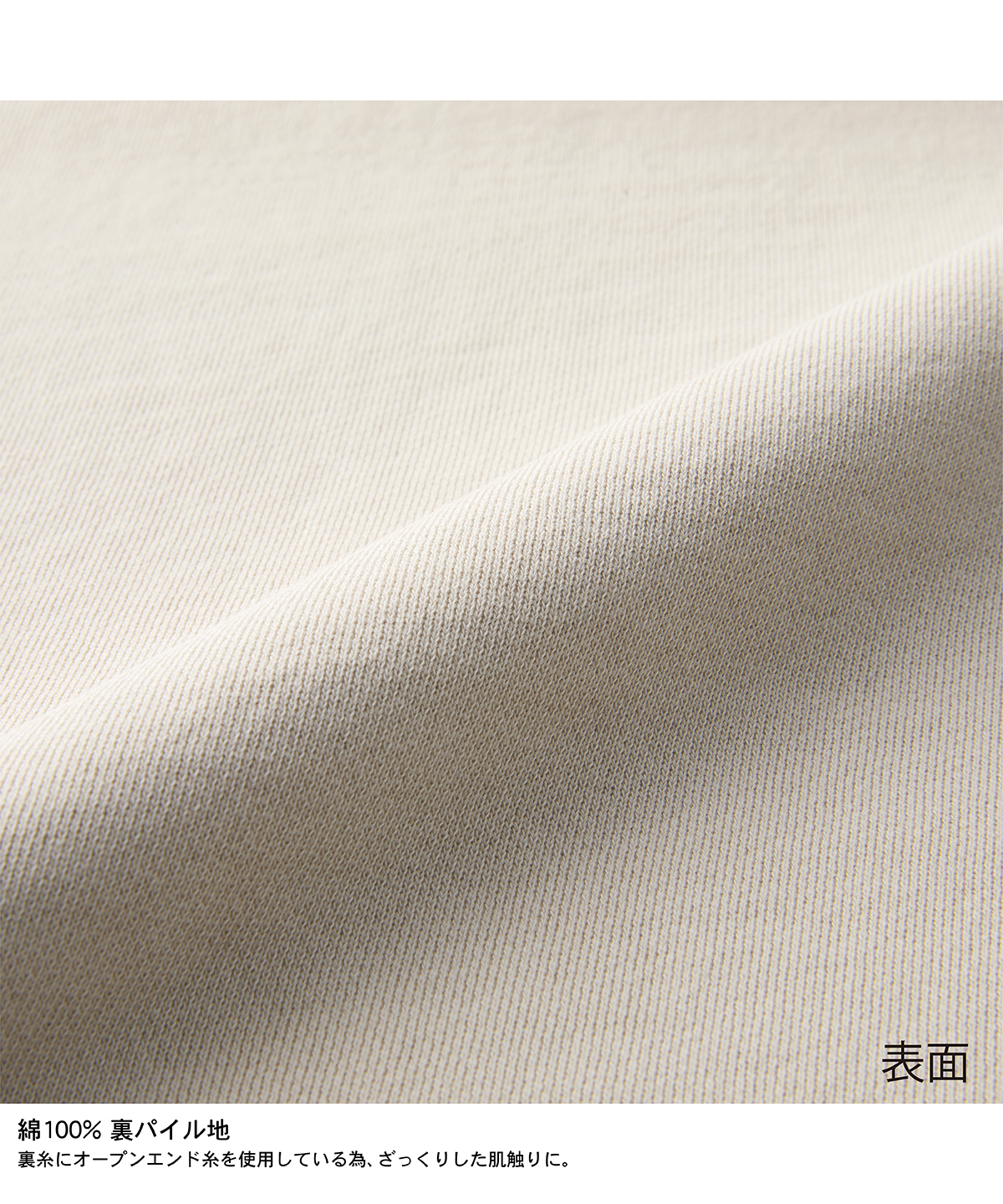 | 綿100%裏パイル地 | 裏糸にオープンエンド糸を使用している為、ざっくりした肌触りに。 |