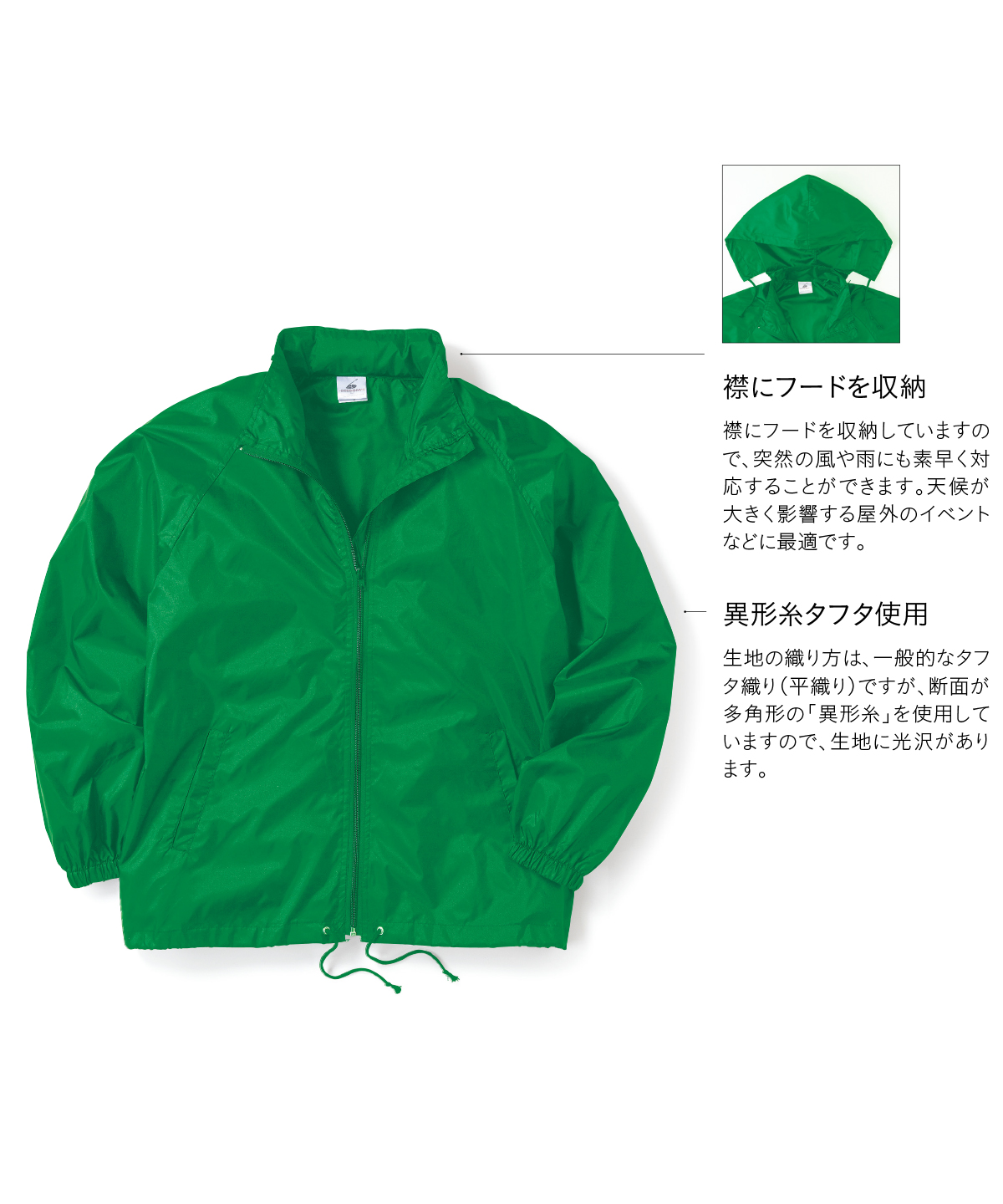 | 襟にフードを収納 | 襟にフードを収納していますので、突然の風や雨にも素早く対応することができます。天候が大きく影響する屋外のイベントなどに最適です。 |